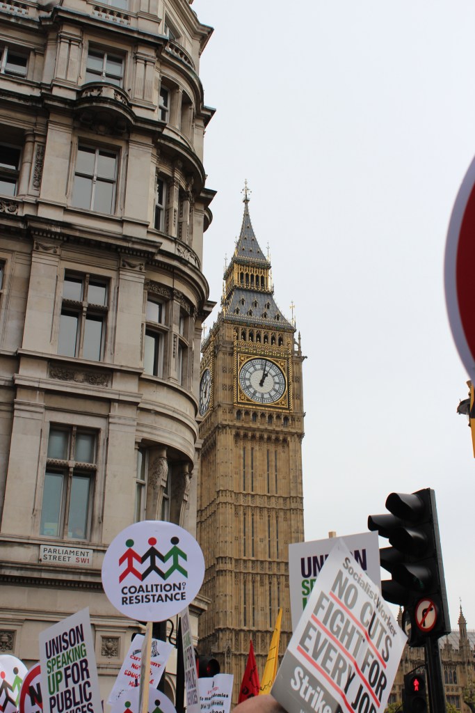 In London the crowd gathered in Hyde Park where amongst the Trade Union chiefs, the Labour leader Ed Miliband gave a speech by saying, “They cut taxes for millionaires and they raise taxes for ordinary families” and accused David Cameron of “clinging” to policies which were not working.